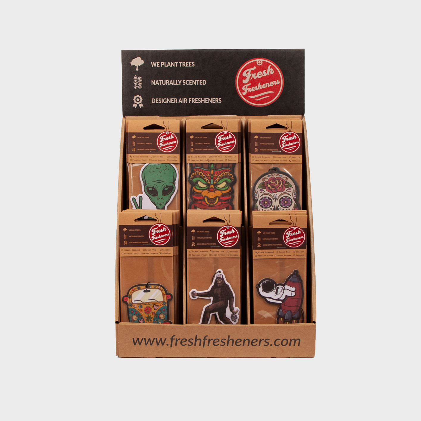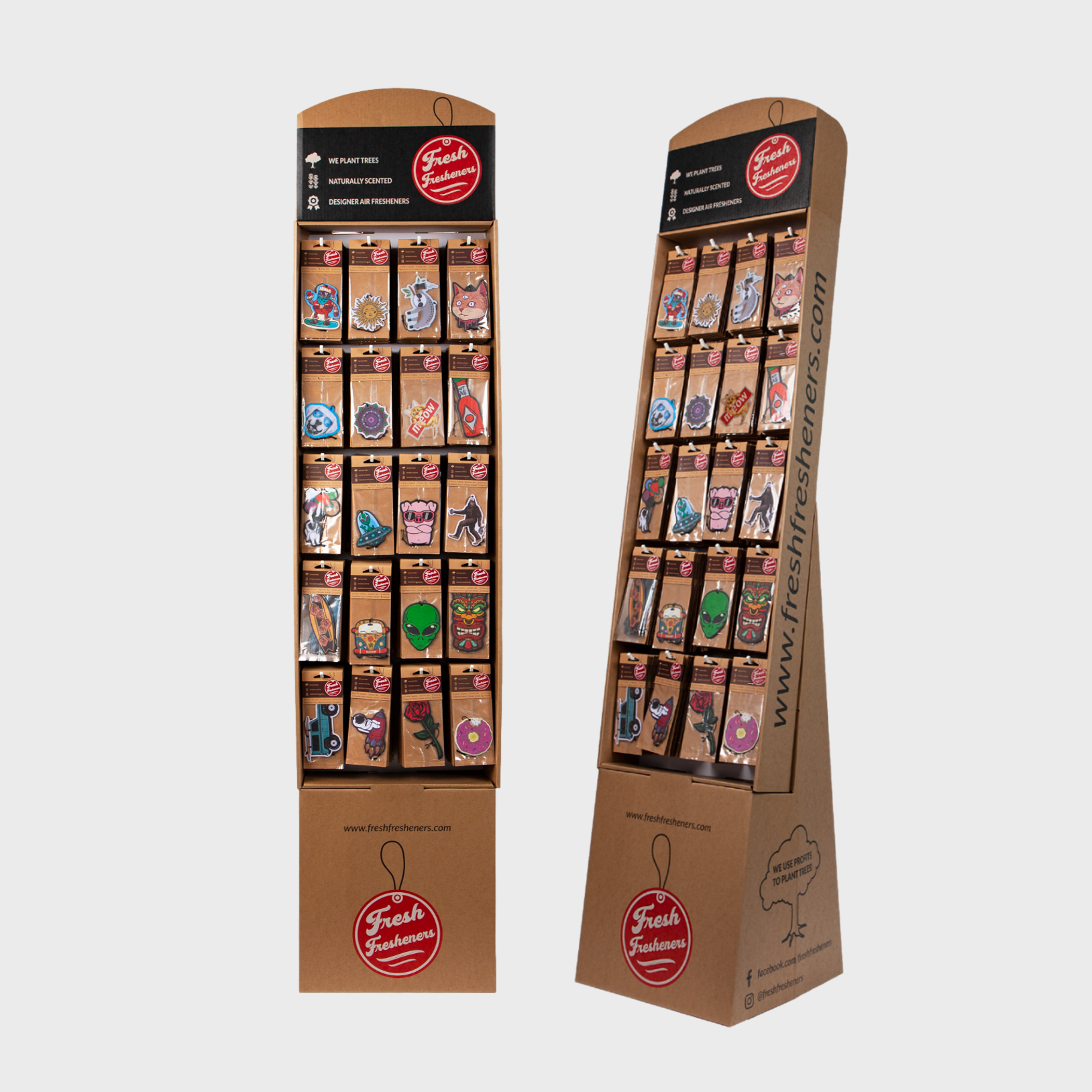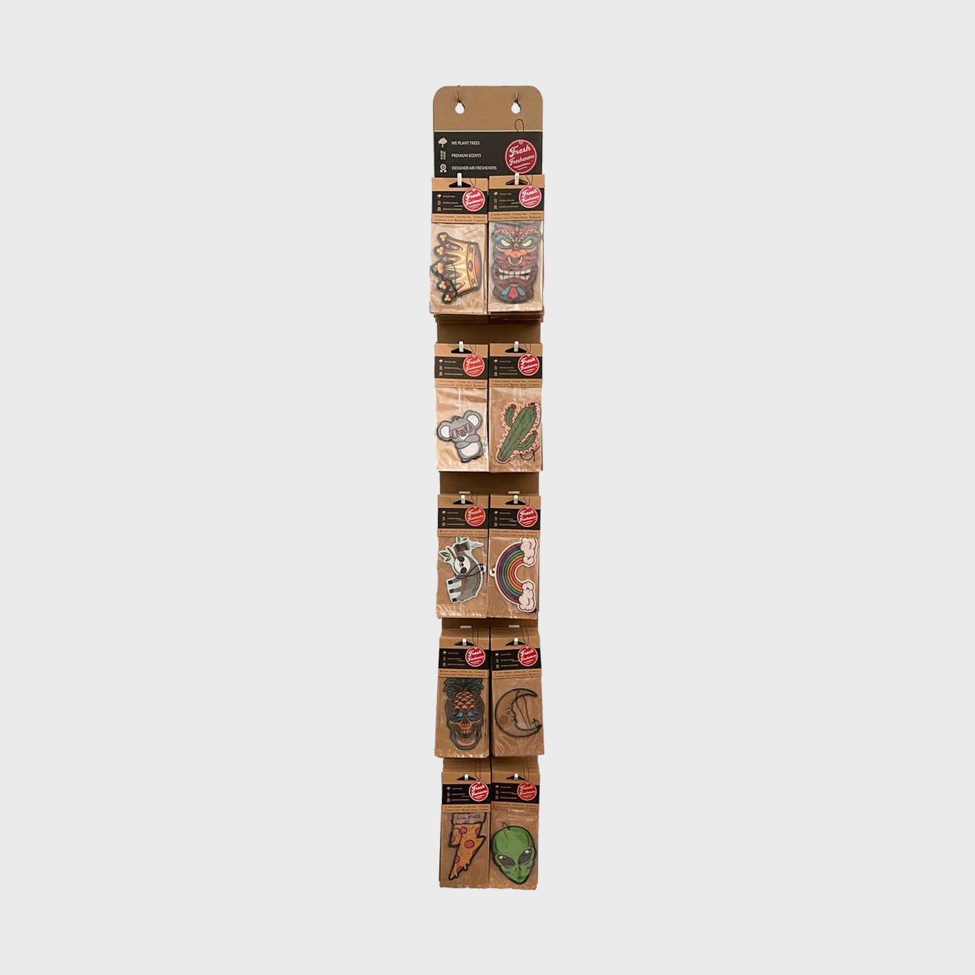 Our space saving hanging displays come with 120 units total, up to 10 designs of your choosing, with 12 units per design in an assortment of scents.
